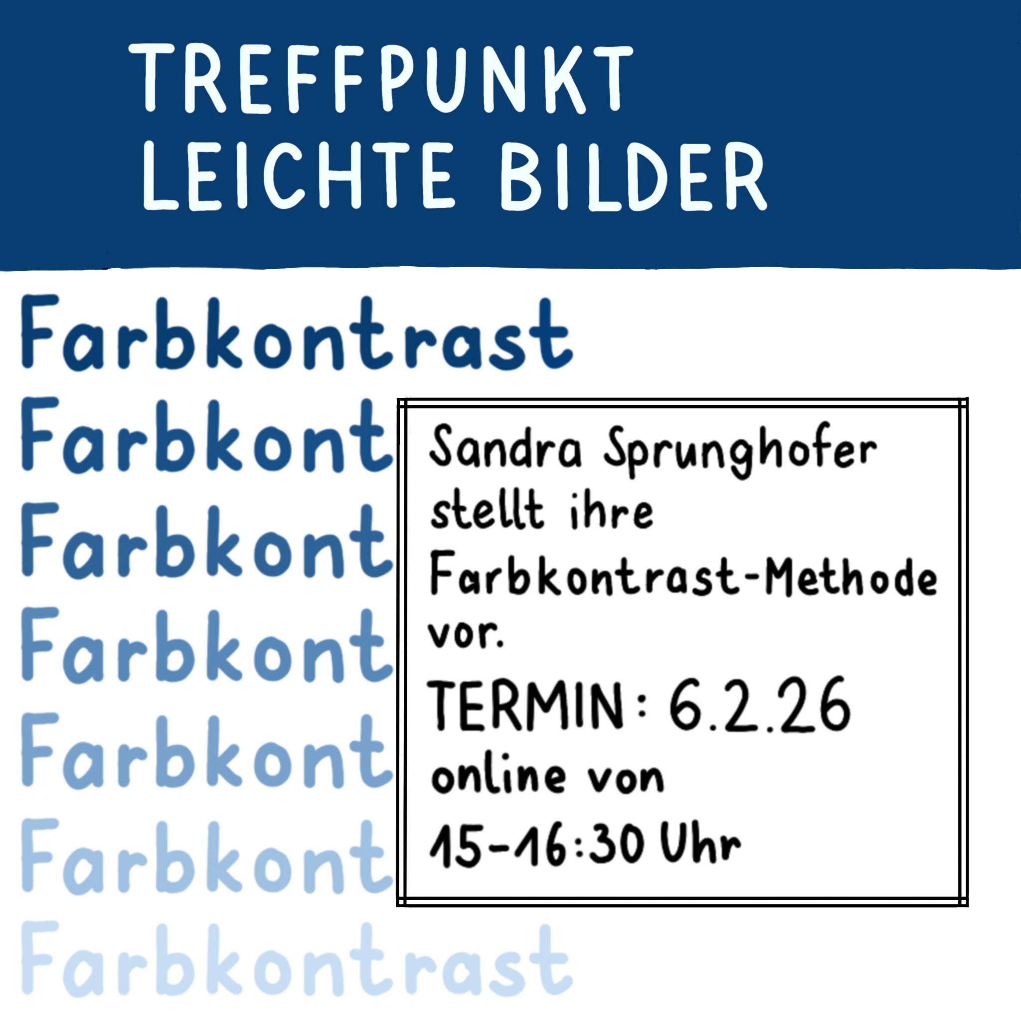 Zum Beispiel zum Treffpunkt Leichte Bilder. Jeden ersten Freitag im Monat treffen wir uns, um Bilder und Grafiken auf Verständlichkeit zu prüfen und neue klarere Vorschläge zu finden. Mit dabei sind immer verschiedene Prüfer*innen – unsere Expert*innen für visuelle Klarheit – die die Bilder live und vor den Teilnehmenden unter die Lupe nehmen. Je nach Kontext sind das Menschen mit sog. Lernschwierigkeiten oder mit Seheinschränkung. Durch ihr Feedback bekommen wir live mit, wie Bilder wirken und leichter verständlich gemacht werden können. Für alle! Dieses Meetup richtet sich an Grafiker*innen und Illustrator*innen, Leichte-Sprache-Anwender*innen und alle, die sich für eine leichte visuelle Kommunikation interessieren.